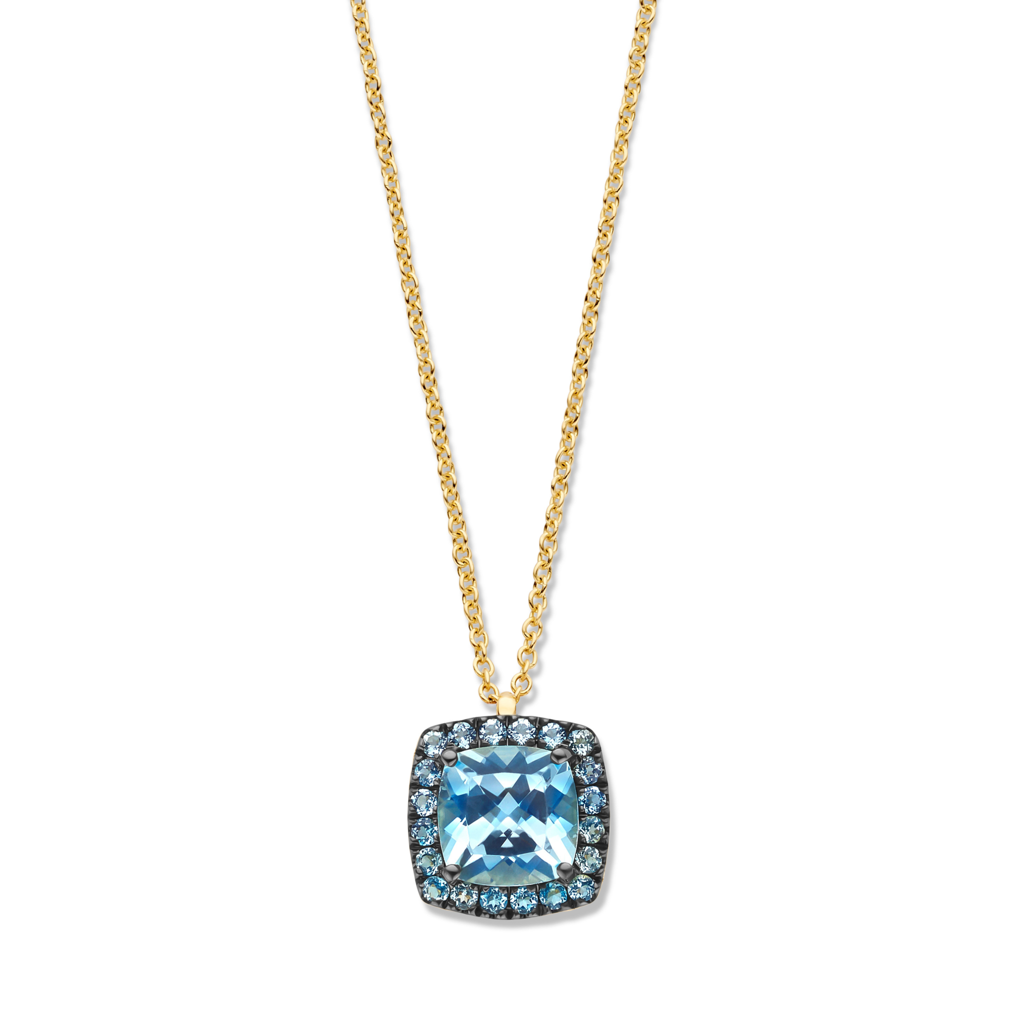 Account aanmakenEen gouden collier met een vierzijdig facet geslepen blauwe topaas gezet in een chatonzetting met vier zetpootjes. De afmeting van de edelsteen is 8 x 8 millimeter. Entourage is gezet met facet geslepen zwitserse topaas. Collier met ronde ankerschakel 1,1 mm., verstelbaar 42 of 45 cm. Het collier is verkrijgbaar in 14 of 18 karaat geel-, rosé of witgoud.