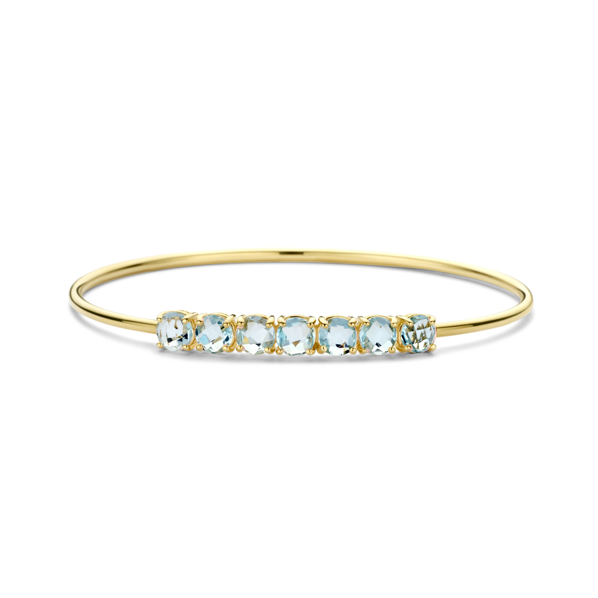 Account aanmakenEen gouden armband met rond schaakbord geslepen blauwe topaas in een chatonzetting met vier zetpootjes. De armband heeft een rond afgewerkte band. Afmeting van de edelstenen is 5 millimeter. De armband is verkrijgbaar in 14 of 18 karaat geel-, rosé of witgoud.